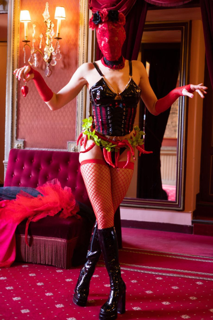 La questionnant sur son parcours, Saphir me confiait effectivement venir de la scène burlesque mais préférer au « burlesque classique » à l’esthétique rockabilly, fifties ou sixties – magistralement représentée par Dita Von Teese, le « new burlesque », underground, plus libre, comique, trash, varié…